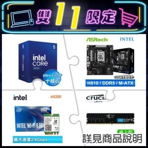 Intel Core Ultra 5 225F+華擎H810M-H主機板+Intel AX200 Wi-Fi6 M.2無線網卡+美光D5-5600 16G記憶體