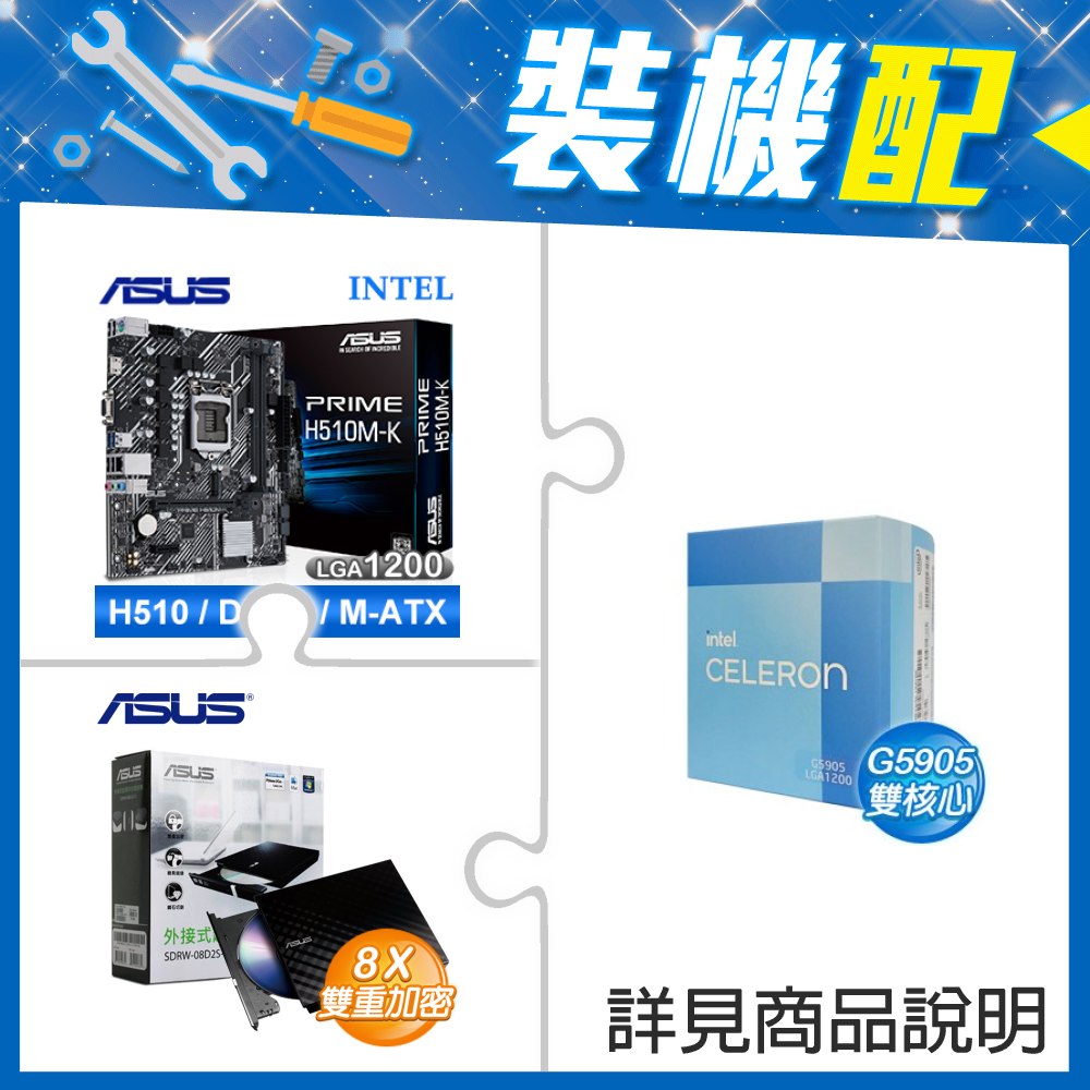 ☆裝機配★ G5905《彩盒全球保》+華碩 PRIME H510M-K M-ATX主機板+華碩 SDRW-08D2S-U 外接式燒錄機《黑》