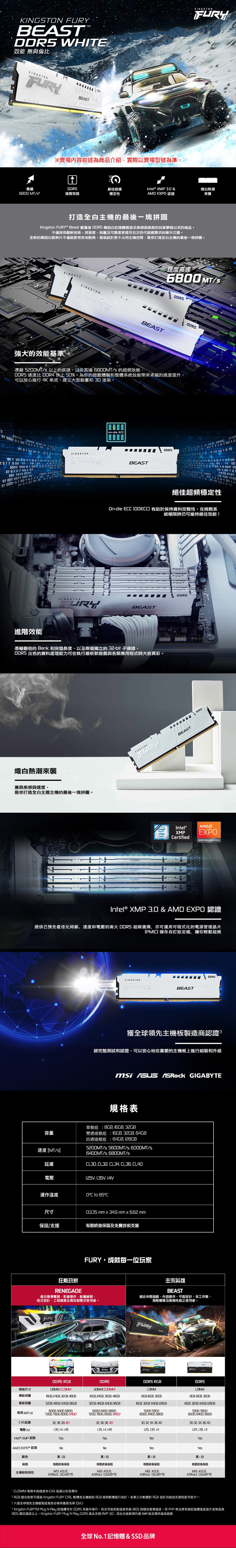 Kingston 金士頓 FURY Beast 獸獵者 DDR5-6000 32G*2 CL30 桌上型超頻記憶體(支援XMP3.0、EXPO)《白》(KF560C30BWEK2-64)