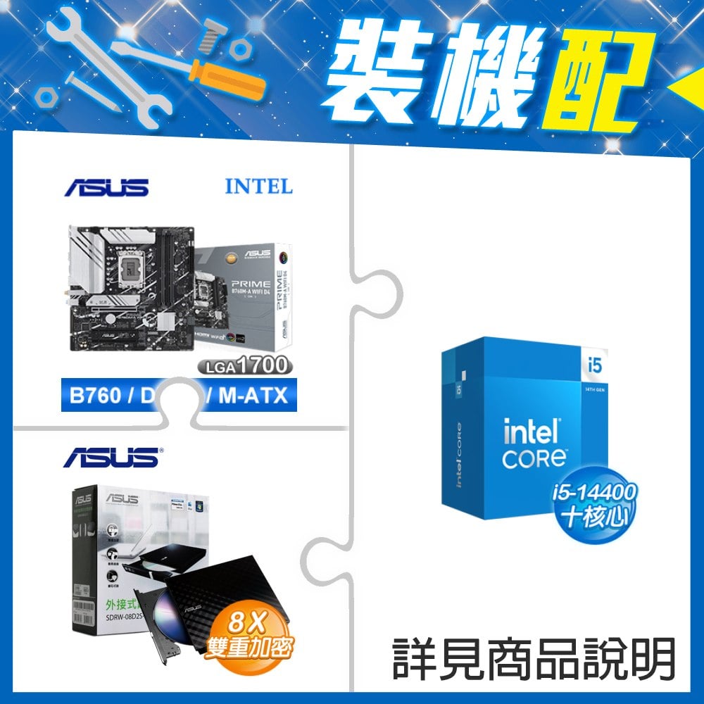 ☆裝機配★ i5-14400F+華碩 PRIME B760M-A WIFI D4-CSM 主機板+華碩 SDRW-08D2S-U 外接式燒錄機《黑》