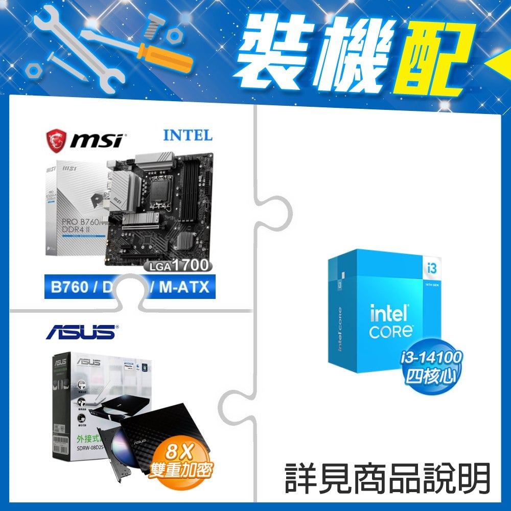 ☆裝機配★ i3-14100F+微星 PRO B760M-A DDR4 II MATX主機板+華碩 SDRW-08D2S-U 外接式燒錄機《黑》