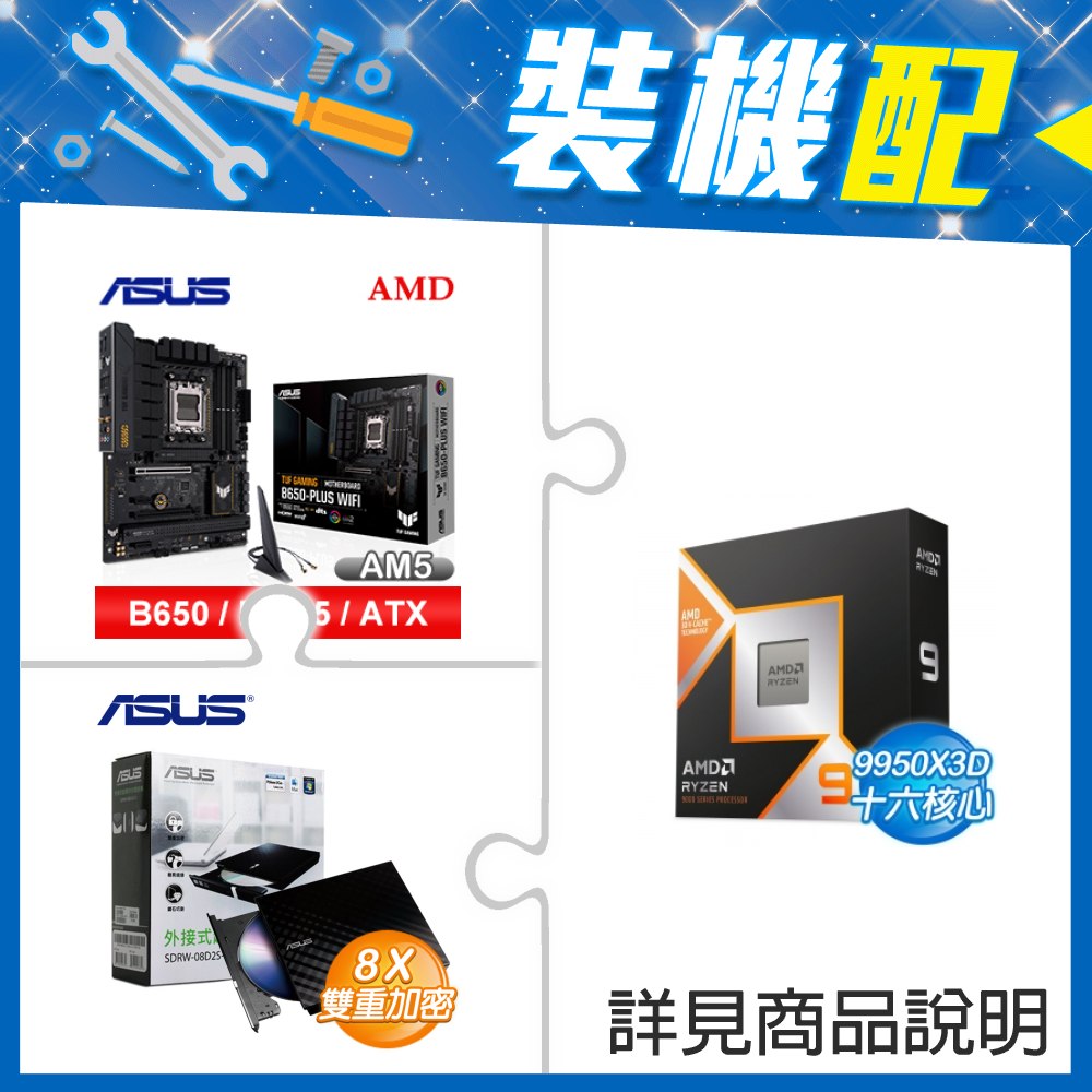 ☆裝機配★ AMD R9 9950X3D+華碩 TUF GAMING B650-PLUS WIFI ATX主機板+華碩 SDRW-08D2S-U 外接式燒錄機《黑》