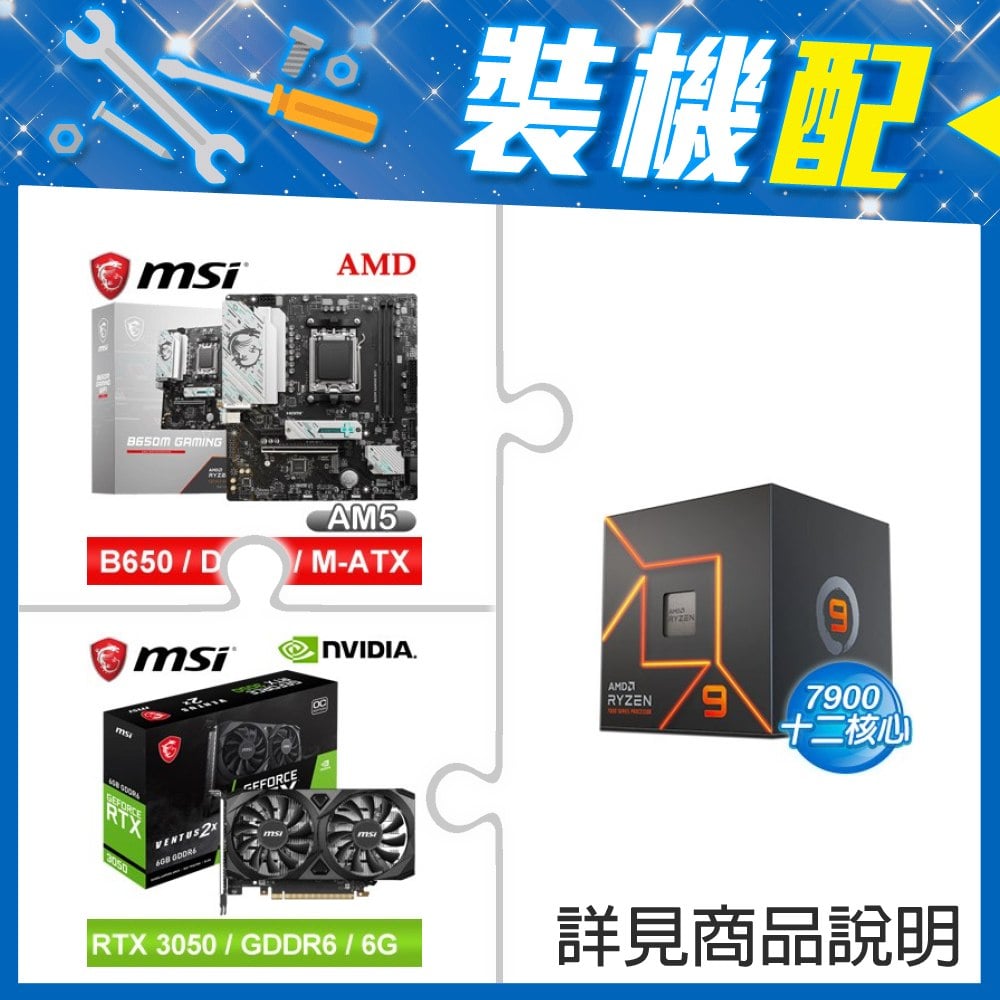 ☆裝機配★ AMD R9 7900+微星 B650M GAMING WIFI M-ATX主機板+微星 RTX 3050 VENTUS 2X 6G OC 顯示卡