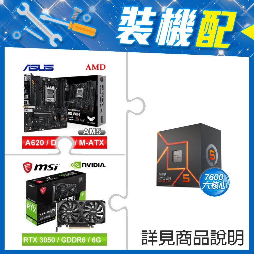 ☆裝機配★ AMD R5 7600+華碩 TUF GAMING A620M-PLUS WIFI MATX主機板+微星 RTX 3050 VENTUS 2X 6G OC 顯示卡