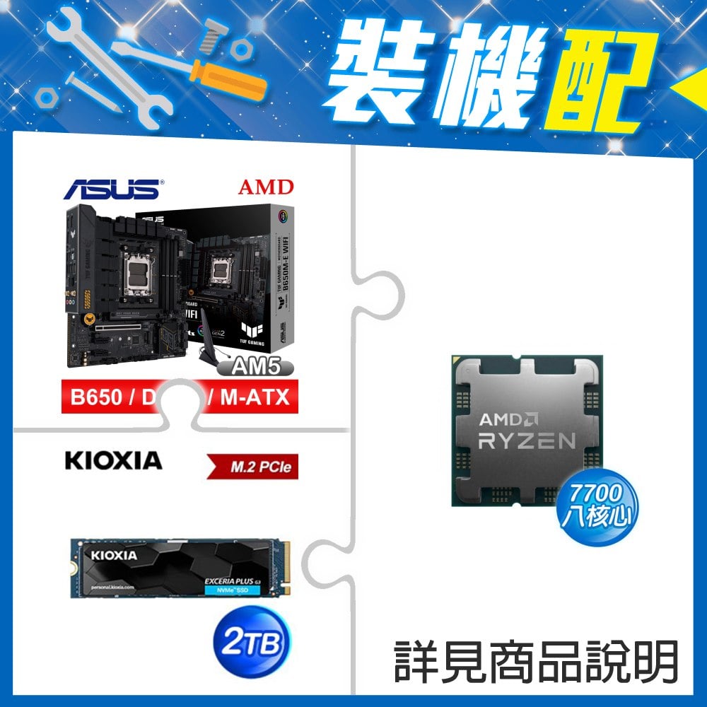 ☆裝機配★ AMD R7 7700 MPK+華碩 TUF GAMING B650M-E WIFI D5 MATX主機板+鎧俠 EXCERIA PLUS G3 2TB PCIe Gen4x4 SSD