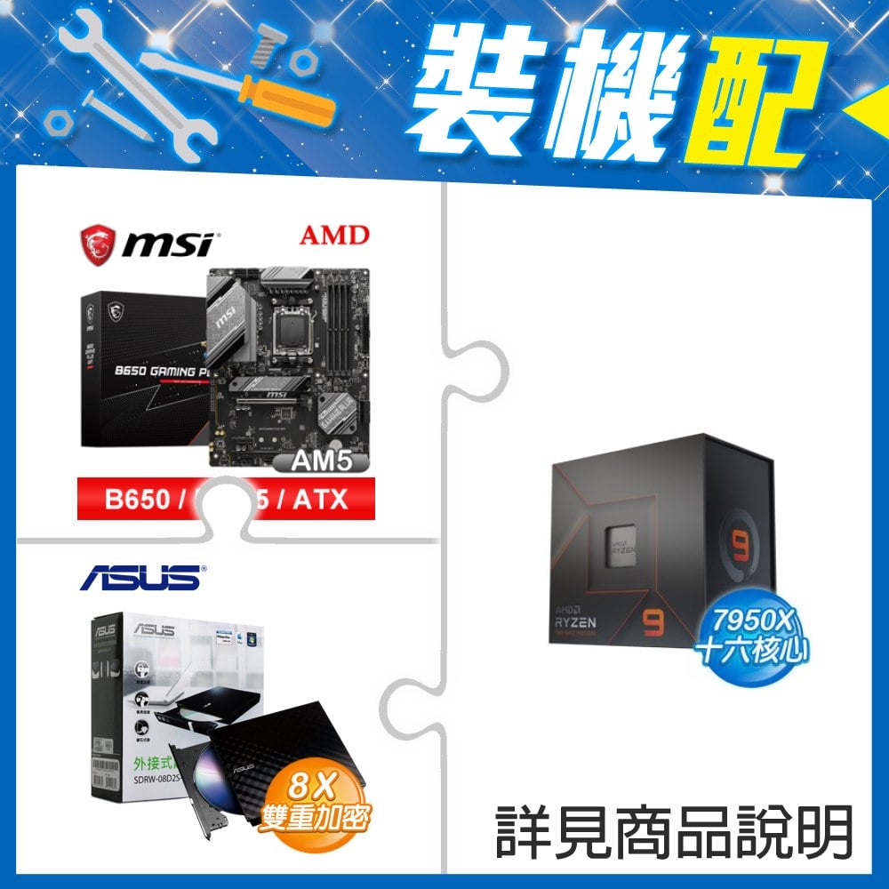 ☆裝機配★ AMD R9 7950X+微星 B650 GAMING PLUS WIFI D5 ATX主機板+華碩 SDRW-08D2S-U 外接式燒錄機《黑》