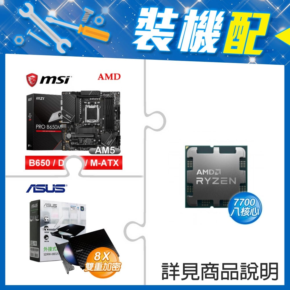 ☆裝機配★ AMD R7 7700 MPK+微星 PRO B650M-A WIFI D5 M-ATX主機板+華碩 SDRW-08D2S-U 外接式燒錄機《黑》