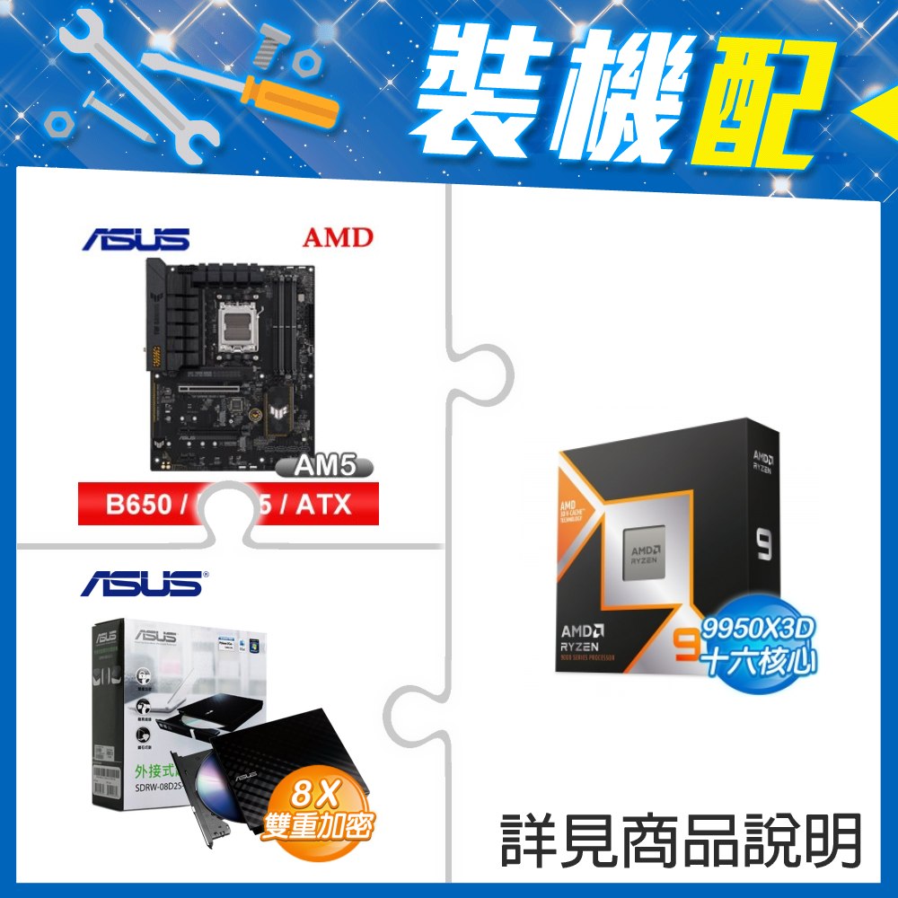 ☆裝機配★ AMD R9 9950X3D+華碩 TUF GAMING B650-E WIFI ATX主機板+華碩 SDRW-08D2S-U 外接式燒錄機《黑》