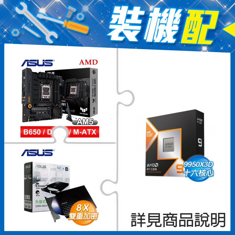 ☆裝機配★ AMD R9 9950X3D+華碩 TUF GAMING B650M-E WIFI D5 MATX主機板+華碩 SDRW-08D2S-U 外接式燒錄機《黑》