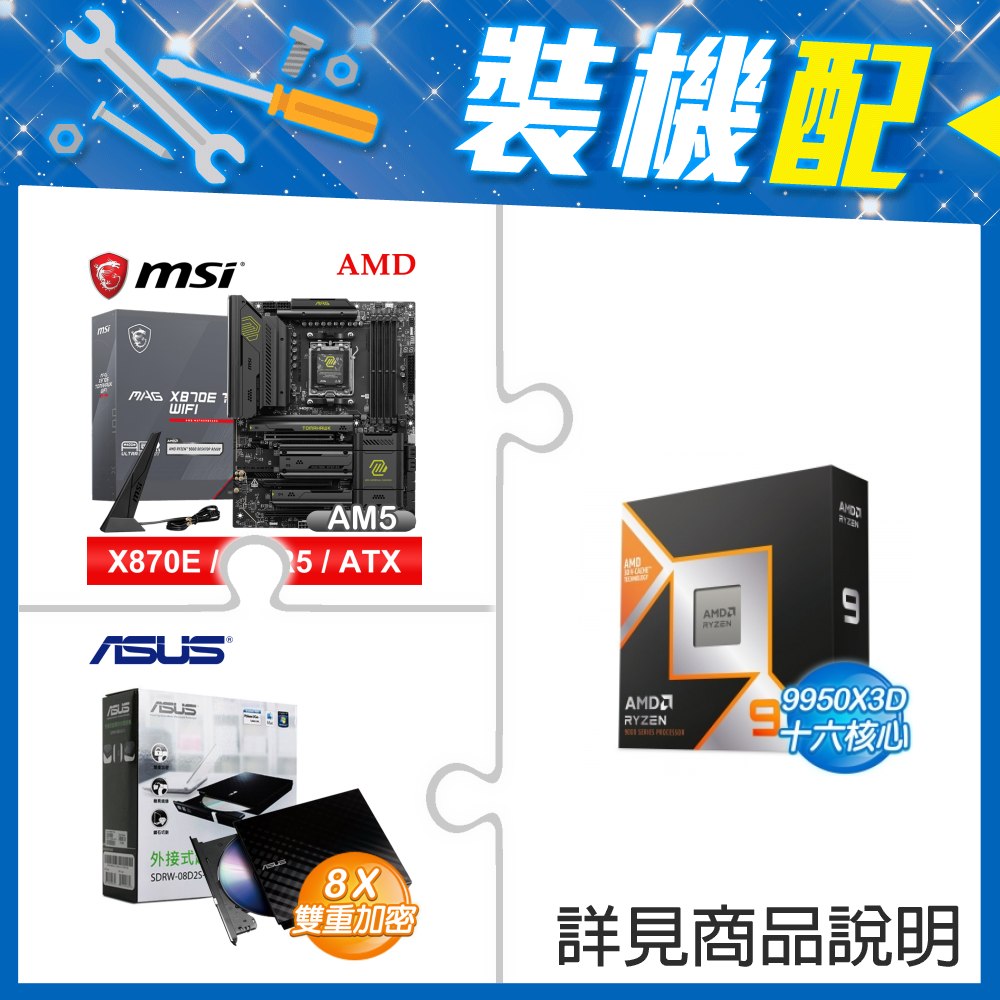 ☆裝機配★ AMD R9 9950X3D+微星 MAG X870E TOMAHAWK WIFI ATX主機板+華碩 SDRW-08D2S-U 外接式燒錄機《黑》