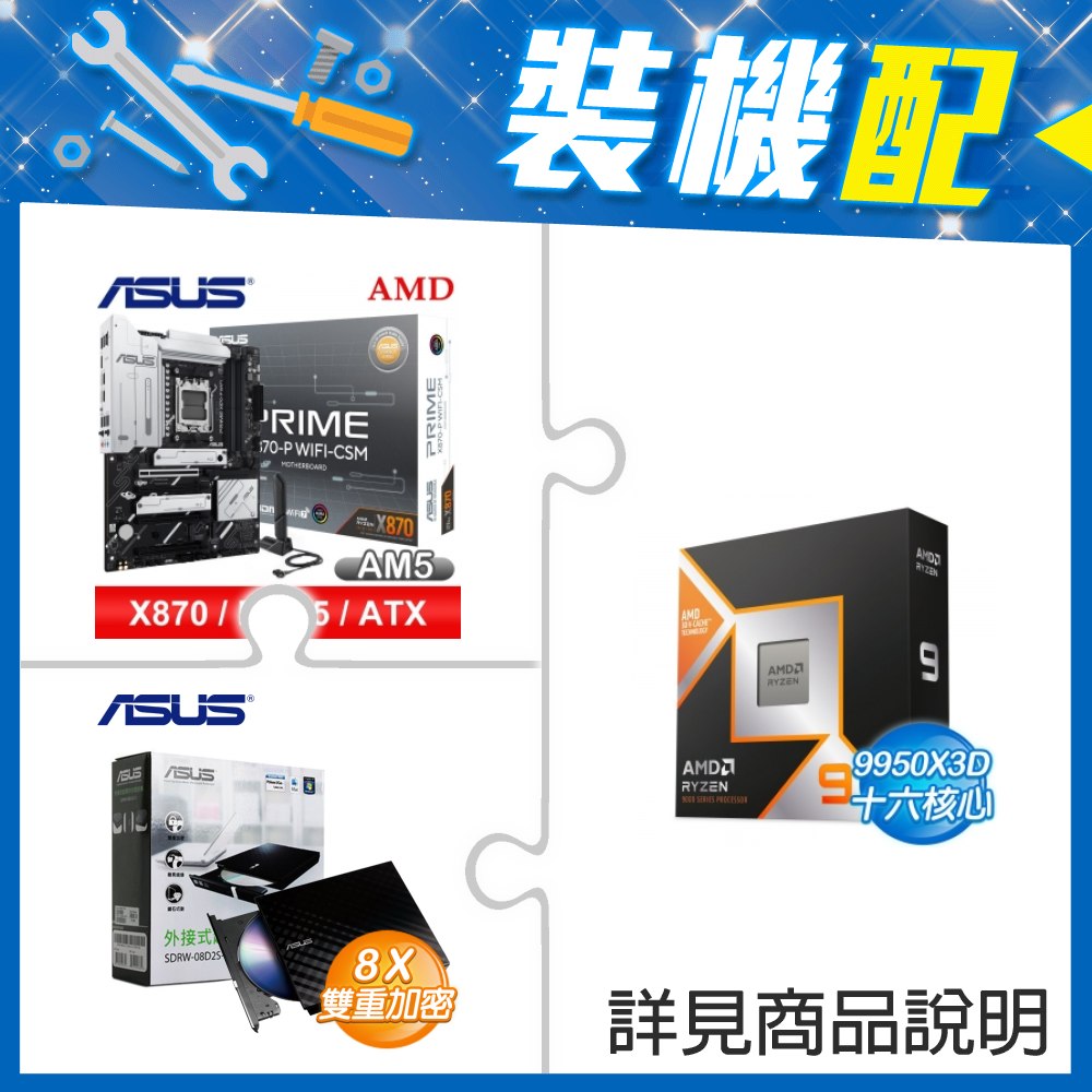 ☆裝機配★ AMD R9 9950X3D+華碩 PRIME X870-P WIFI-CSM ATX主機板+華碩 SDRW-08D2S-U 外接式燒錄機《黑》