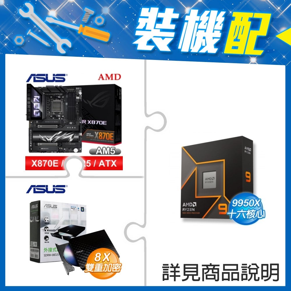 ☆裝機配★ AMD R9 9950X+華碩 ROG CROSSHAIR X870E HERO ATX主機板+華碩 SDRW-08D2S-U 外接式燒錄機《黑》