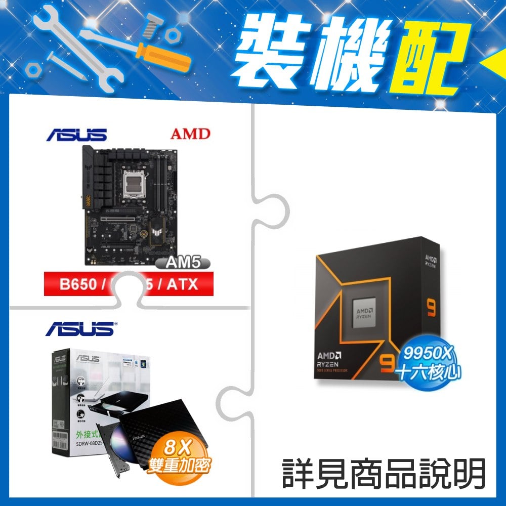 ☆裝機配★ AMD R9 9950X+華碩 TUF GAMING B650-E WIFI ATX主機板+華碩 SDRW-08D2S-U 外接式燒錄機《黑》