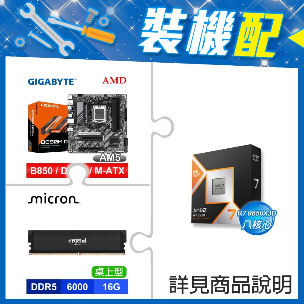 ☆裝機配★ AMD R7 9850X3D+技嘉 B850M DS3H MATX主機板+美光 Crucial PRO DDR5-6000 16G 記憶體