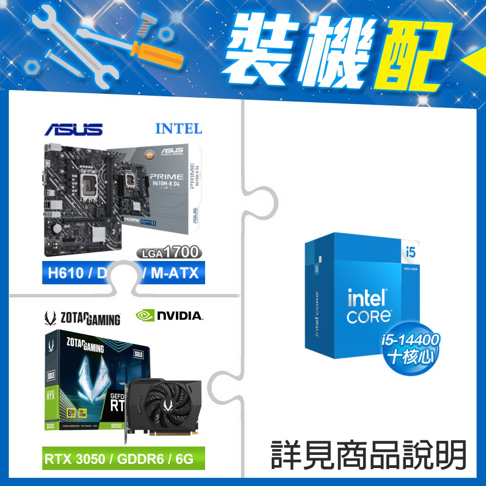 ☆裝機配★ i5-14400+華碩 PRIME H610M-K D4-CSM M-ATX主機板+ZOTAC RTX3050 6G GDDR6 Solo 顯示卡
