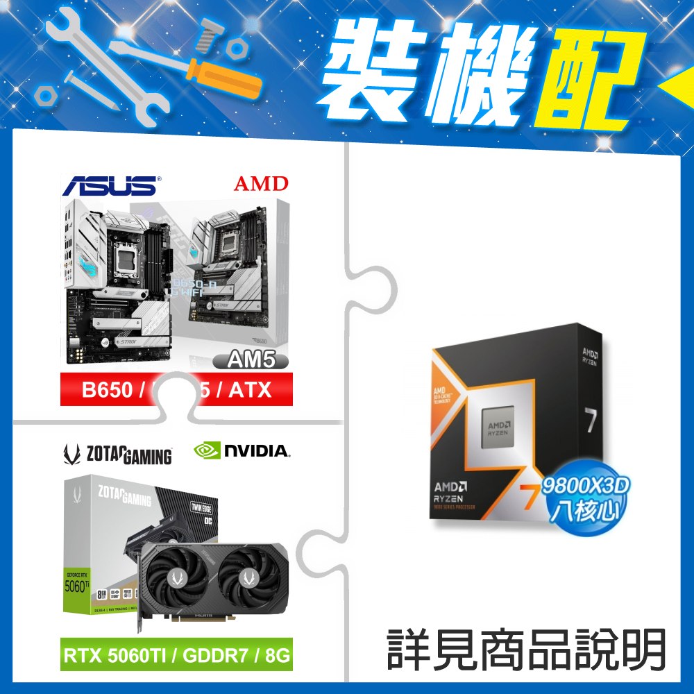 ☆裝機配★ AMD R7 9800X3D+華碩 ROG STRIX B650-A GAMING WIFI ATX主機板+索泰 RTX 5060 TI 8GB Twin Edge OC 顯示卡
