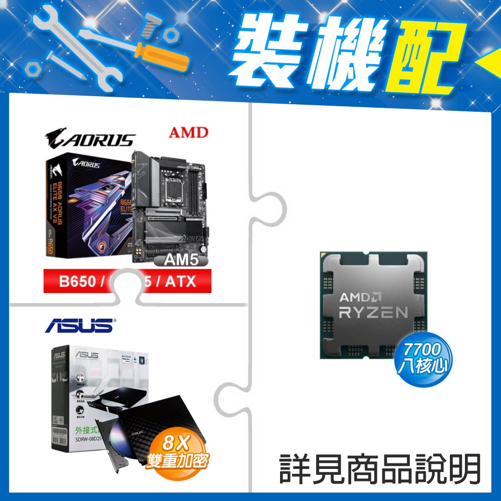 ☆裝機配★ AMD R7 7700 MPK+技嘉 B650 AORUS ELITE AX V2 D5 ATX主機板+華碩 SDRW-08D2S-U 外接式燒錄機《黑》