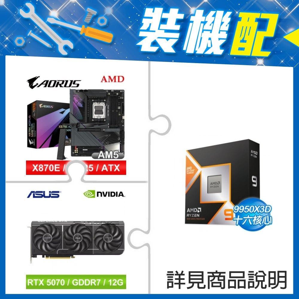 ☆裝機配★ AMD R9 9950X3D+技嘉 X870E AORUS MASTER ATX主機板+華碩 PRIME-RTX5070-O12G 顯示卡