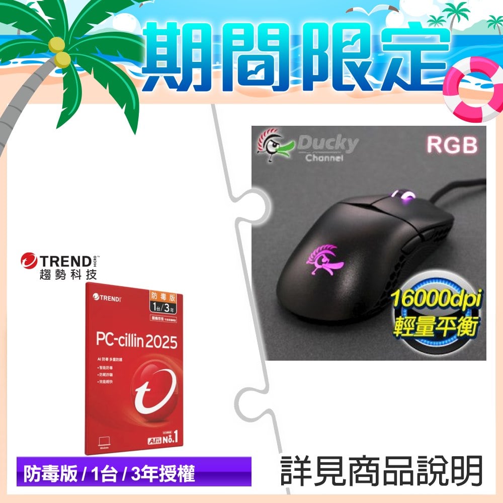 ☆期間限定★ Ducky Feather RGB 輕量化光學鼠+PC-cillin 2025 防毒版 三年一台 隨機版 ★送Ducky 厚滑鼠墊