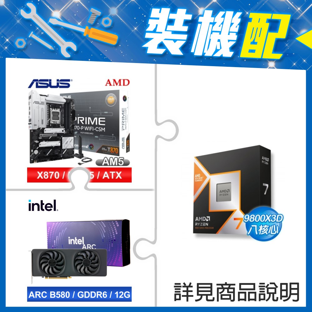 ☆裝機配★ AMD R7 9800X3D+華碩 PRIME X870-P WIFI-CSM ATX主機板+Intel Arc B580 12G 20 Core 顯示卡