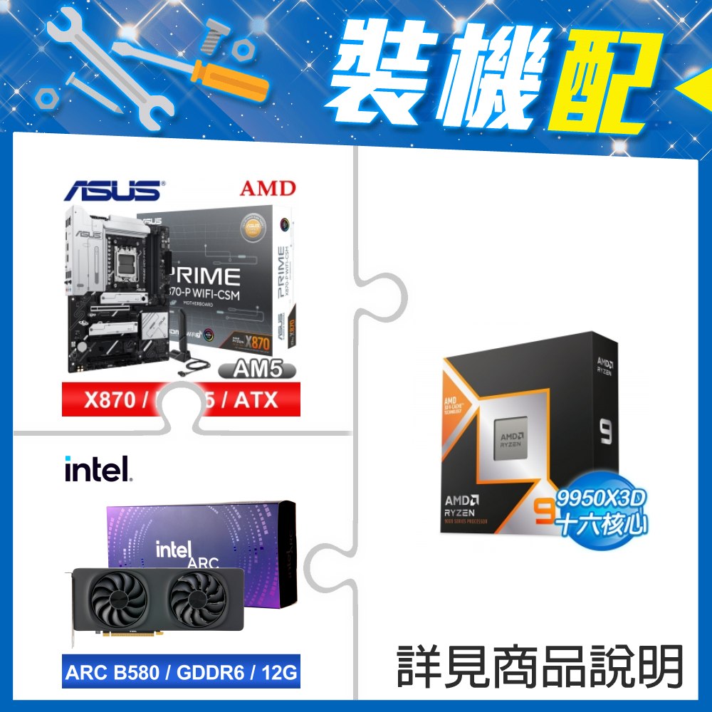 ☆裝機配★ AMD R9 9950X3D+華碩 PRIME X870-P WIFI-CSM ATX主機板+Intel Arc B580 12G 20 Core 顯示卡