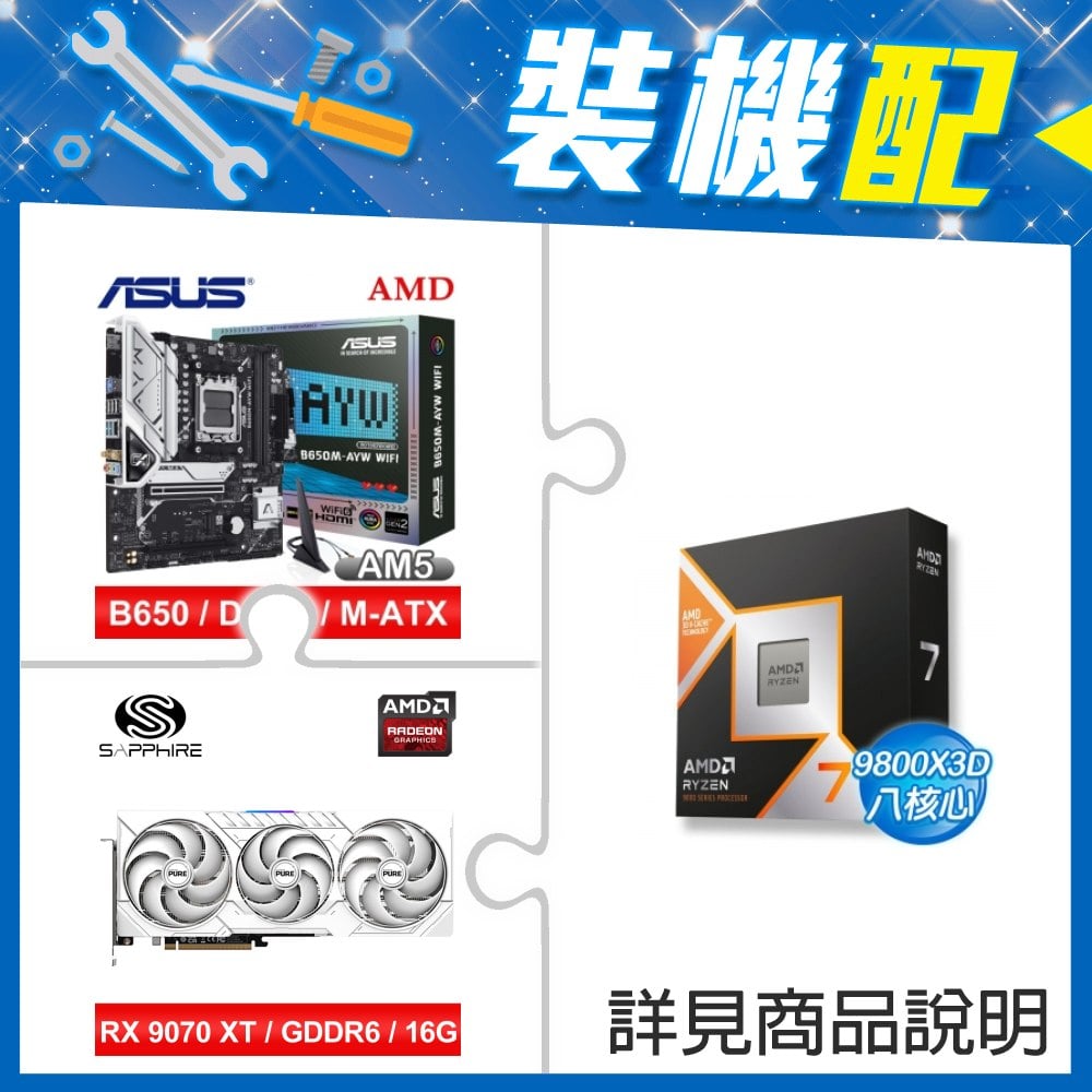 ☆裝機配★ AMD R7 9800X3D+華碩 B650M-AYW WIFI MATX主機板+藍寶石 PURE 極地 RX 9070 XT GAMING OC 16GB 顯示卡