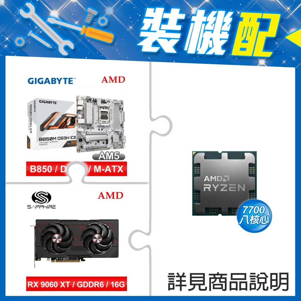 ☆裝機配★ AMD R7 7700 MPK+技嘉 B850M DS3H ICE M-ATX主機板+藍寶石 PULSE 脈動 RX 9060 XT GAMING OC 16GB 顯示卡