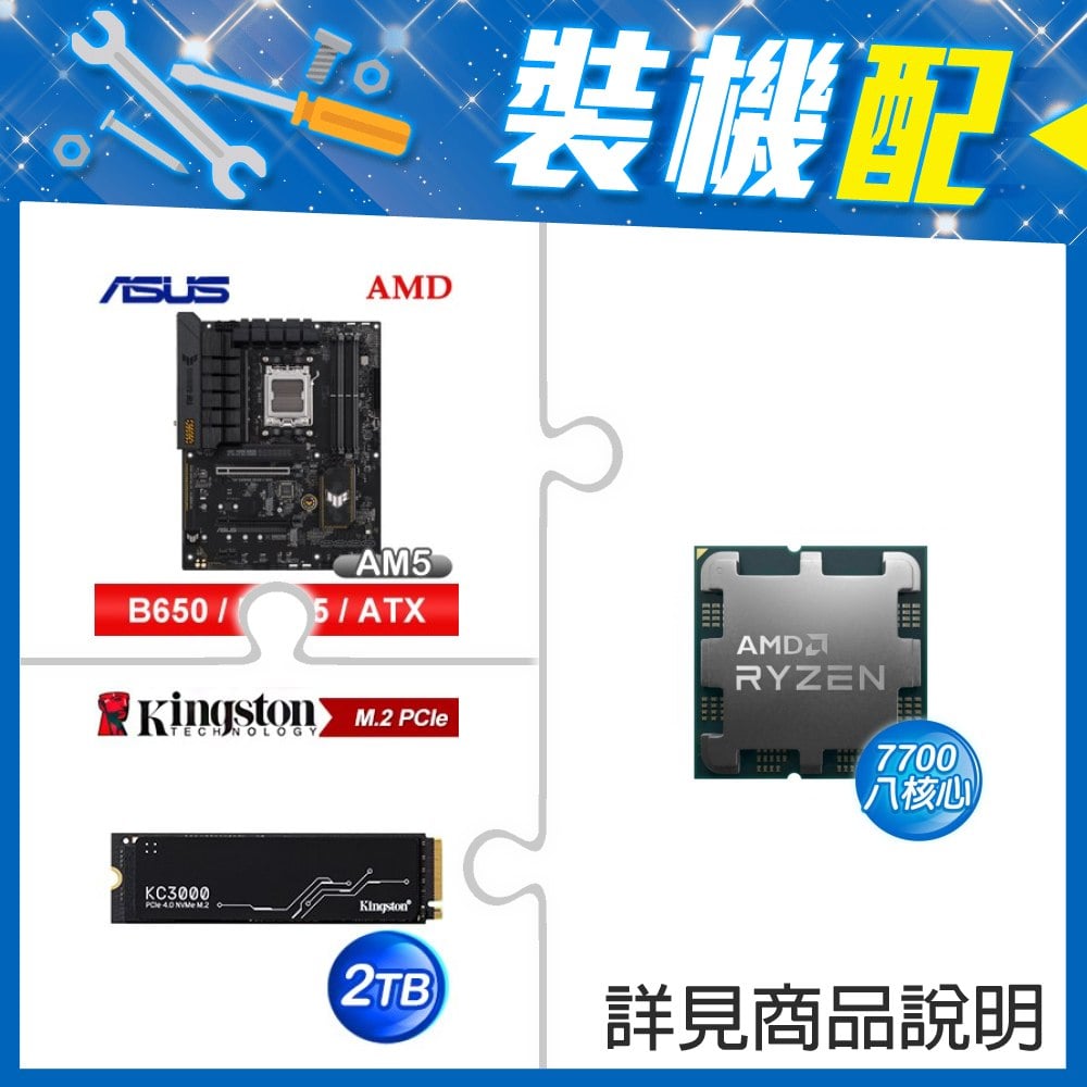 ☆裝機配★ AMD R7 7700 MPK+華碩 TUF GAMING B650-E WIFI ATX主機板+金士頓 KC3000 2TB PCIe 4.0 NVMe M.2 SSD