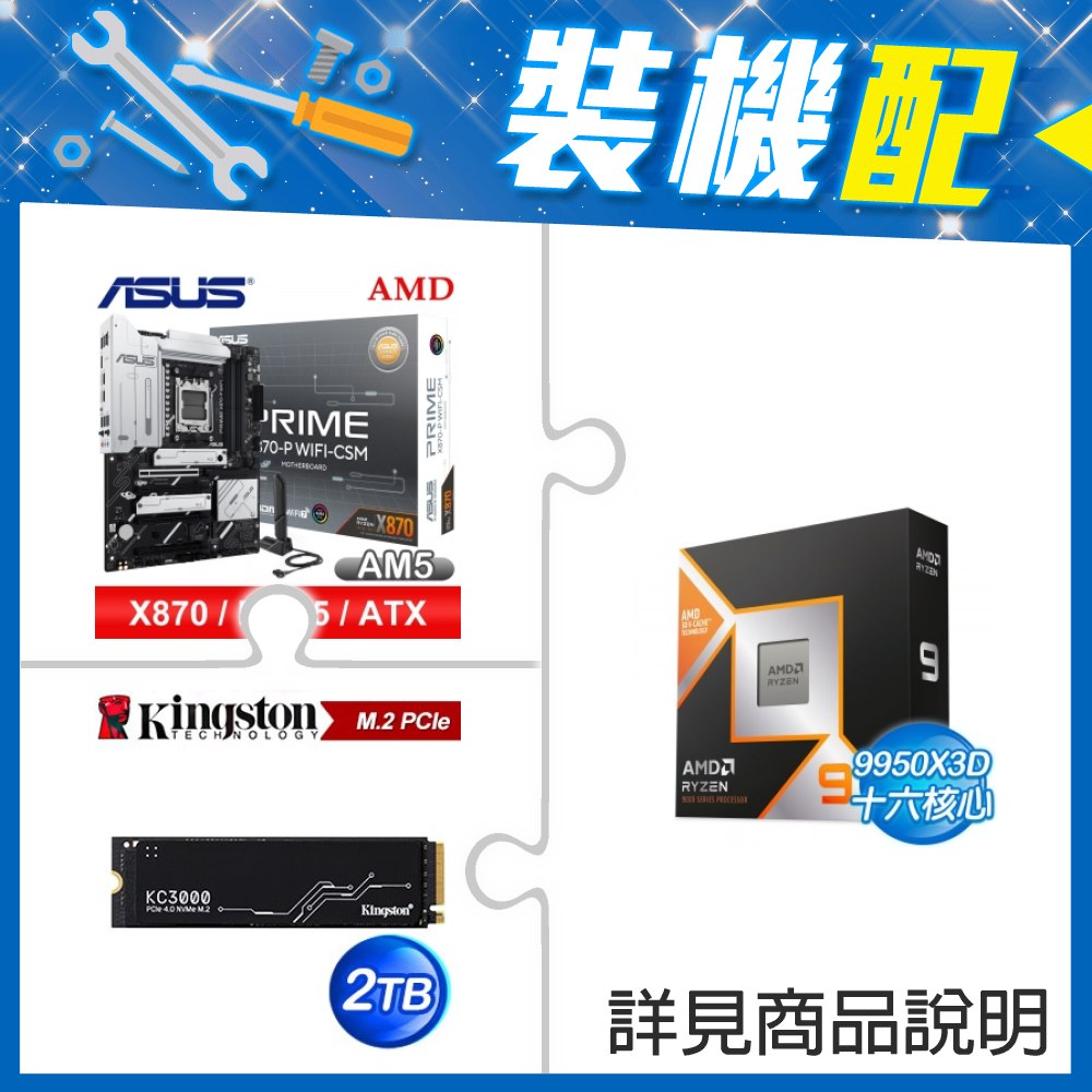 ☆裝機配★ AMD R9 9950X3D+華碩 PRIME X870-P WIFI-CSM ATX主機板+金士頓 KC3000 2TB PCIe 4.0 NVMe M.2 SSD