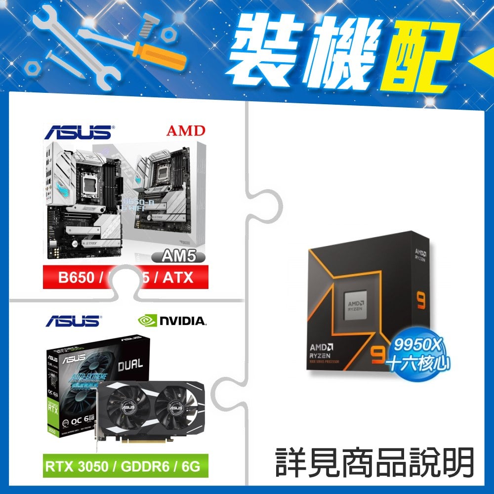 ☆裝機配★ AMD R9 9950X+華碩 ROG STRIX B650-A GAMING WIFI ATX主機板+華碩 DUAL-RTX3050-O6G 顯示卡