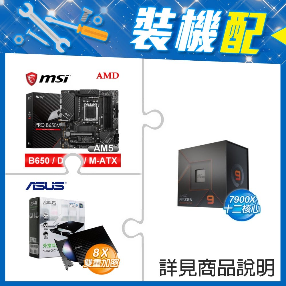 ☆裝機配★ AMD R9 7900X+微星 PRO B650M-A WIFI D5 M-ATX主機板+華碩 SDRW-08D2S-U 外接式燒錄機《黑》