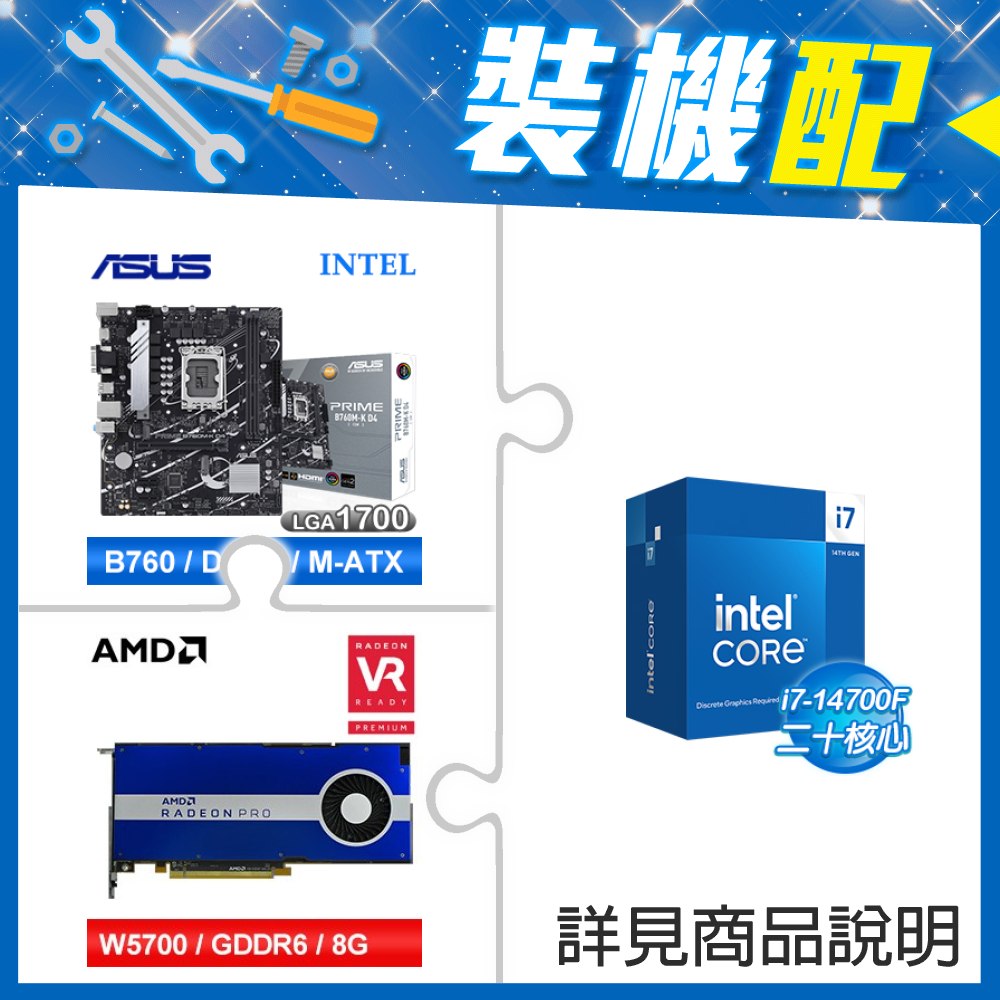 ☆裝機配★ i7-14700F+華碩 PRIME B760M-A WIFI D4-CSM 主機板+AMD RadeonPro W5700 8G 256bit專業繪圖卡