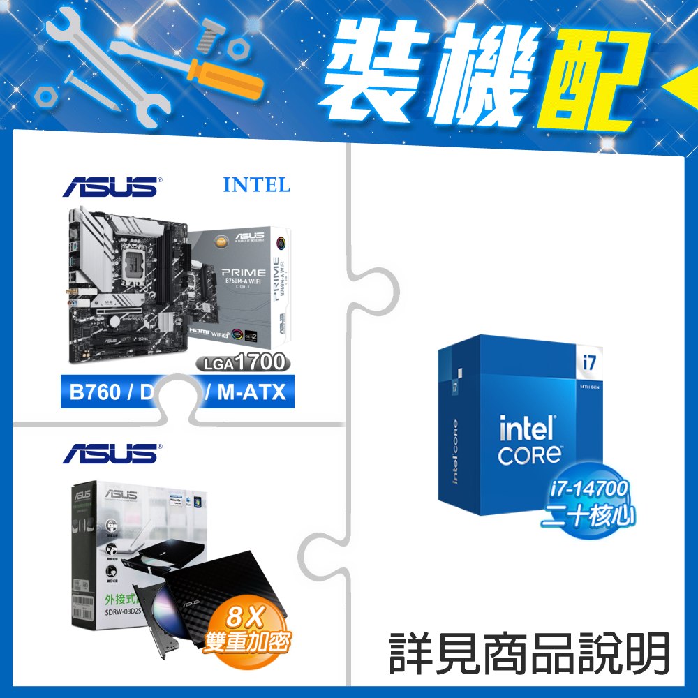 ☆裝機配★ i7-14700F+華碩 PRIME B760M-A WIFI-CSM D5 M-ATX主機板+華碩 SDRW-08D2S-U 外接式燒錄機《黑》