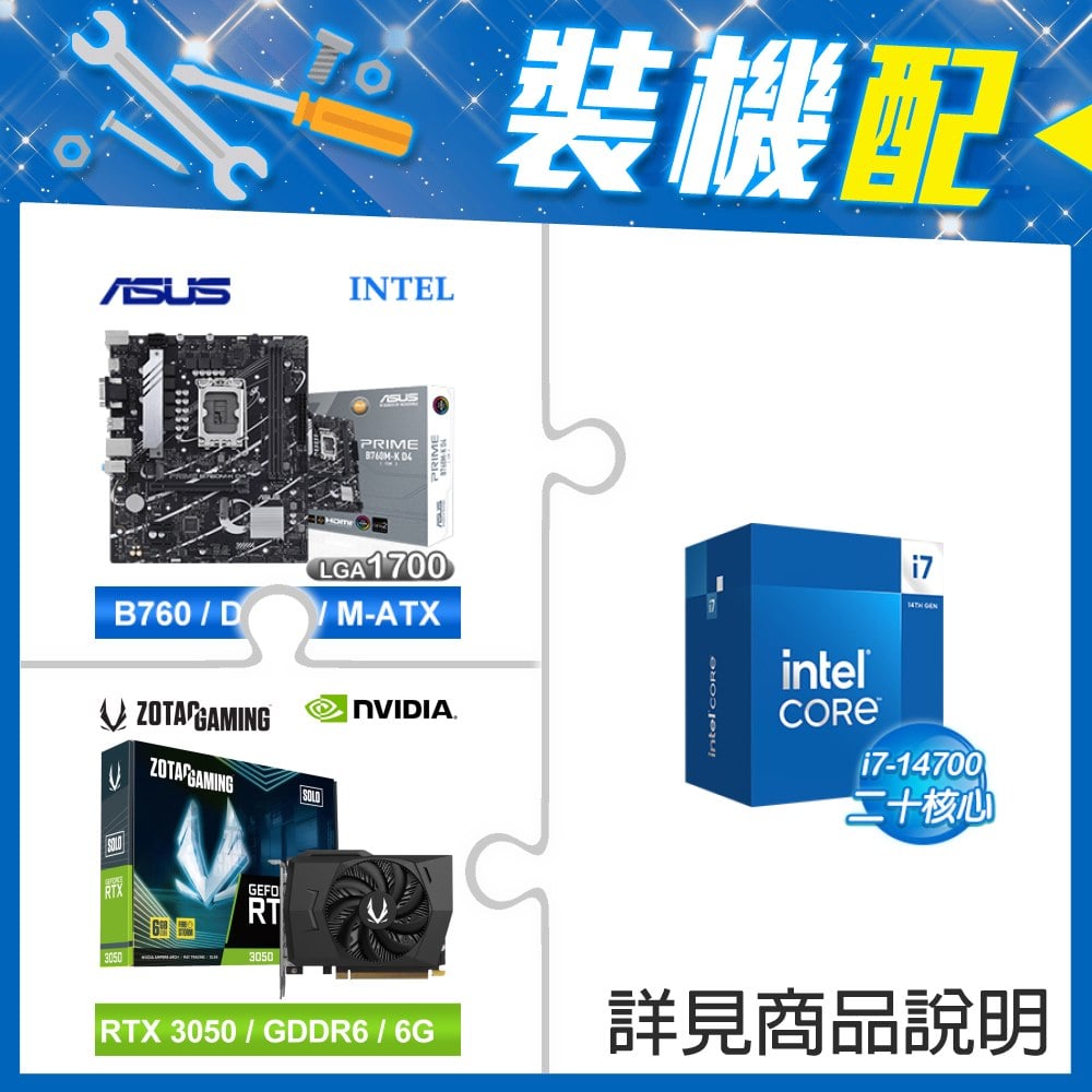 ☆裝機配★ i7-14700+華碩 PRIME B760M-A WIFI-CSM D5 M-ATX主機板+ZOTAC RTX3050 6G GDDR6 Solo 顯示卡