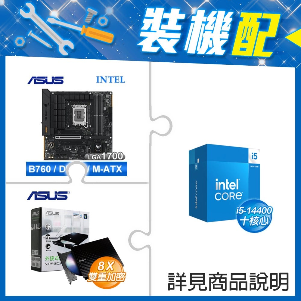 ☆裝機配★ i5-14400+華碩 TUF GAMING B760M-PLUS WIFI II D5 MATX主機板+華碩 SDRW-08D2S-U 外接式燒錄機《黑》
