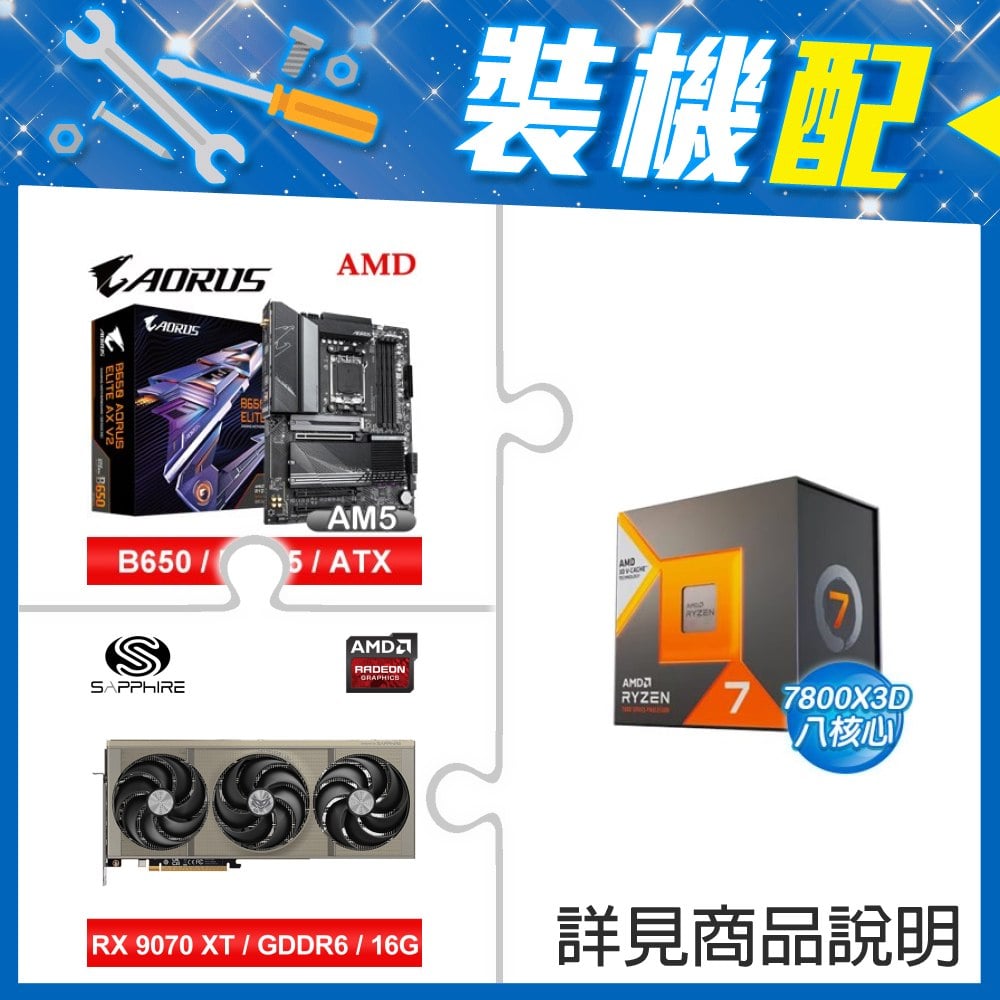 ☆裝機配★ AMD R7 7800X3D+技嘉 B650 AORUS ELITE AX V2 D5 ATX主機板+藍寶石 NITRO+ 氮動 RX 9070 XT GAMING OC 16GB 顯示卡