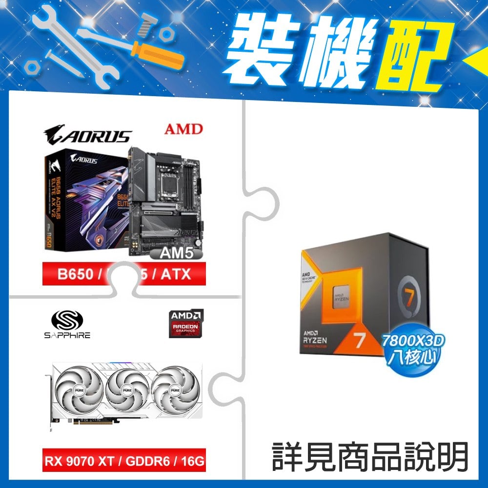 ☆裝機配★ AMD R7 7800X3D+技嘉 B650 AORUS ELITE AX V2 D5 ATX主機板+藍寶石 PURE 極地 RX 9070 XT GAMING OC 16GB 顯示卡