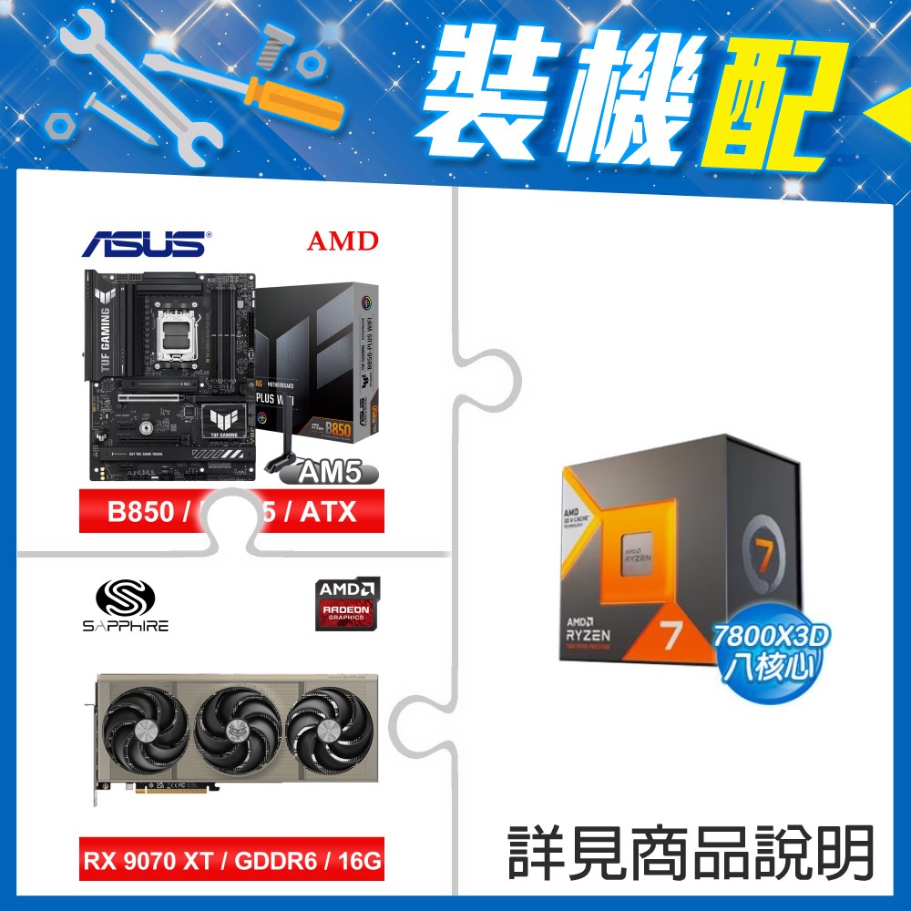 ☆裝機配★ AMD R7 7800X3D+華碩 TUF GAMING B850-PLUS WIFI ATX主機板+藍寶石 NITRO+ 氮動 RX 9070 XT GAMING OC 16GB 顯示卡