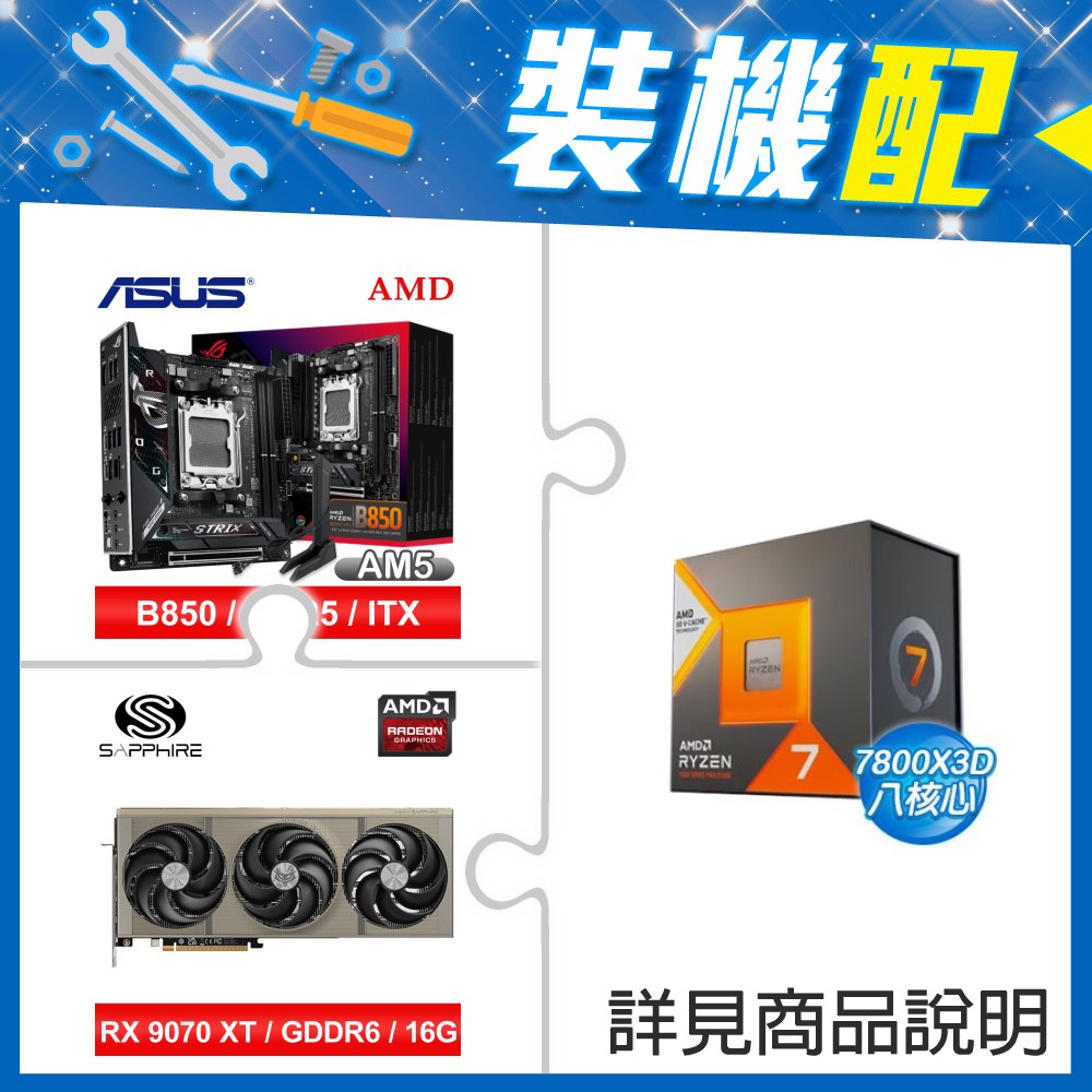 ☆裝機配★ AMD R7 7800X3D+華碩 ROG STRIX B850-I GAMING WIFI ITX主機板+藍寶石 NITRO+ 氮動 RX 9070 XT GAMING OC 16GB 顯示卡