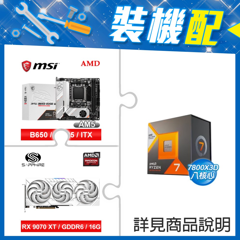 ☆裝機配★ AMD R7 7800X3D+微星 MPG B650I EDGE WIFI ITX主機板+藍寶石 PURE 極地 RX 9070 XT GAMING OC 16GB 顯示卡