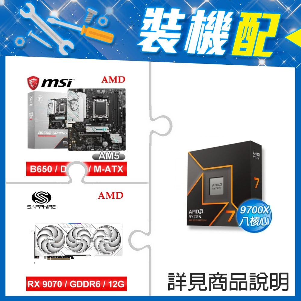 ☆裝機配★ AMD R7 9700X+微星 B650M GAMING WIFI M-ATX主機板+藍寶石 PURE 極地 RX 9070 GRE GAMING OC 12GB 顯示卡