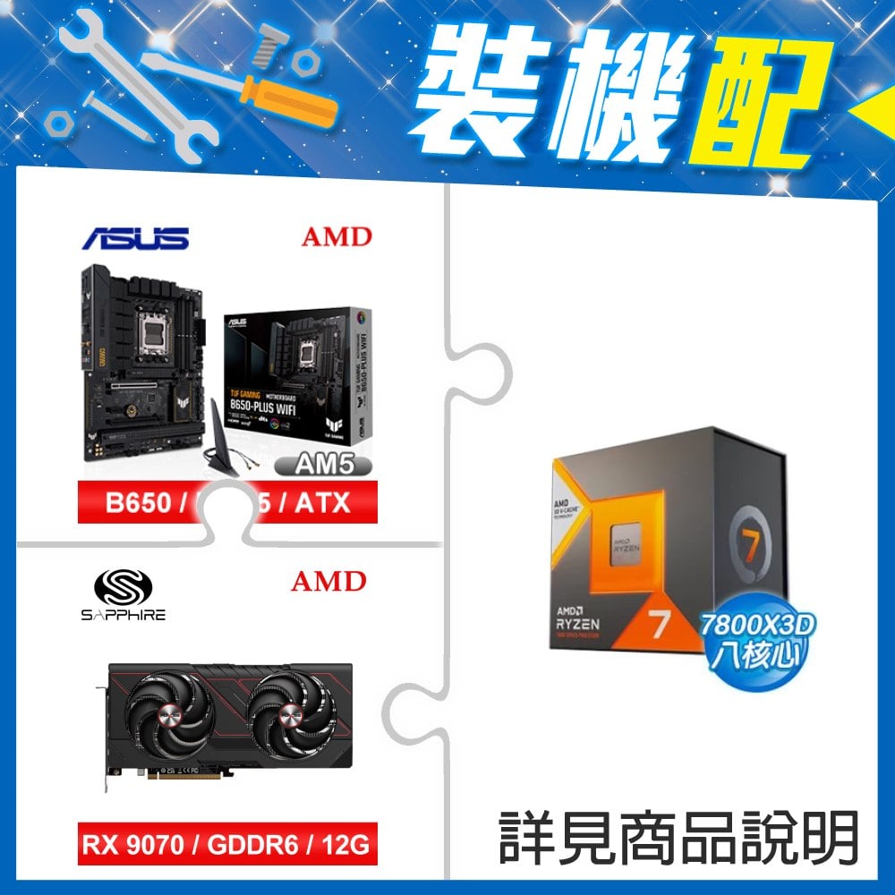 ☆裝機配★ AMD R7 7800X3D+華碩 TUF GAMING B650-PLUS WIFI ATX主機板+藍寶石 PULSE 脈動 RX 9070 GRE GAMING 12GB 顯示卡