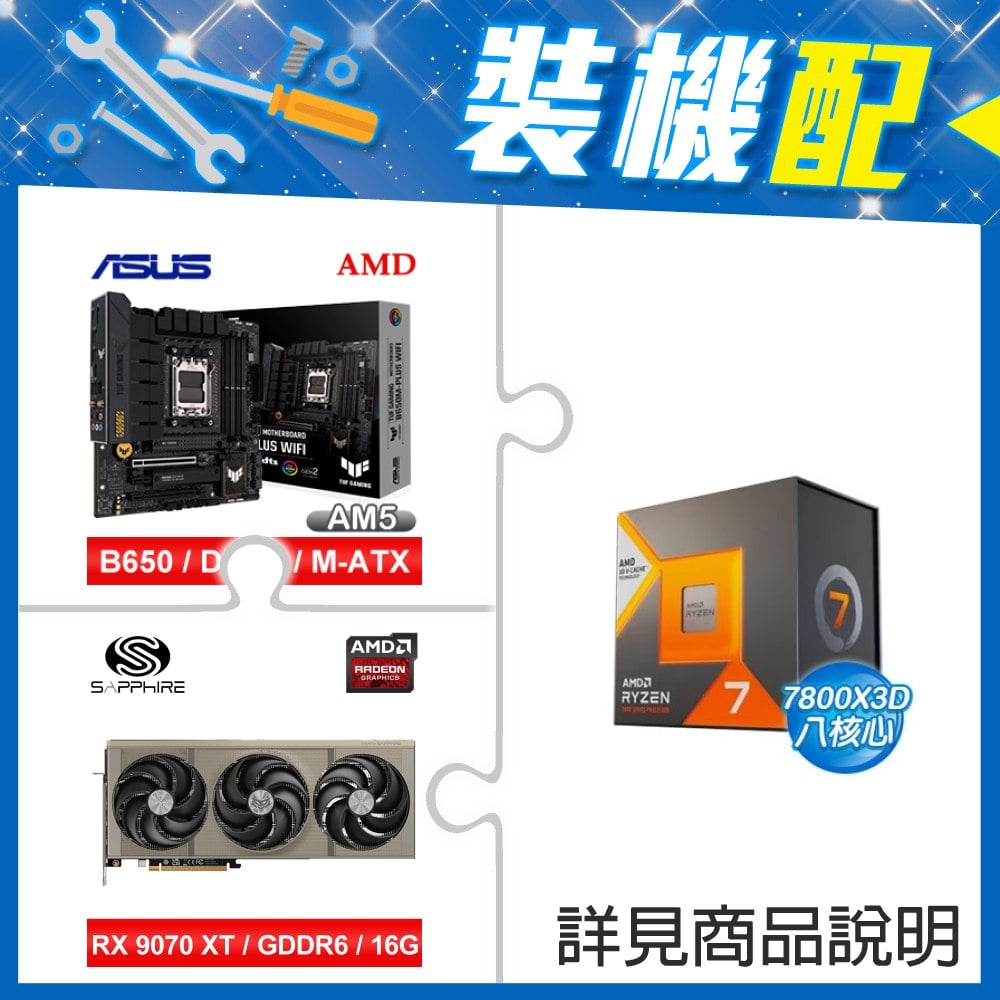 ☆裝機配★ AMD R7 7800X3D+華碩 TUF GAMING B650M-PLUS WIFI M-ATX主機板+藍寶石 PURE 極地 RX 9070 XT GAMING OC 16GB 顯示卡