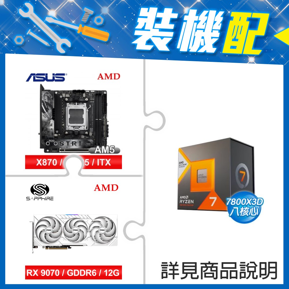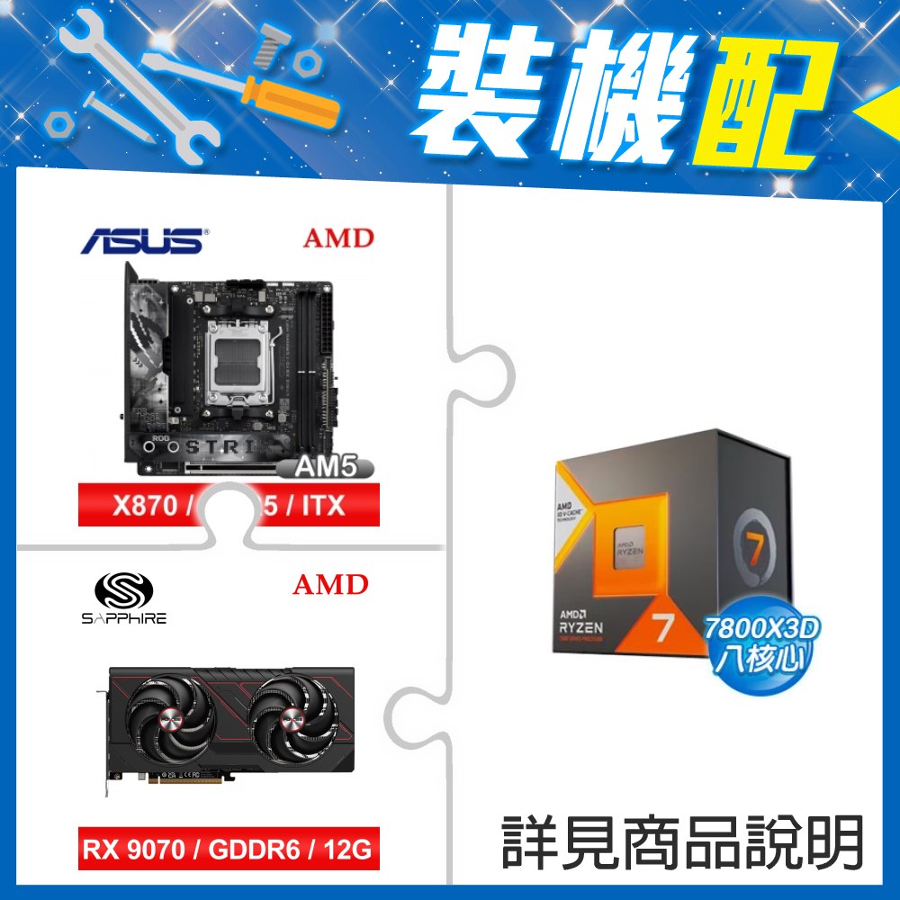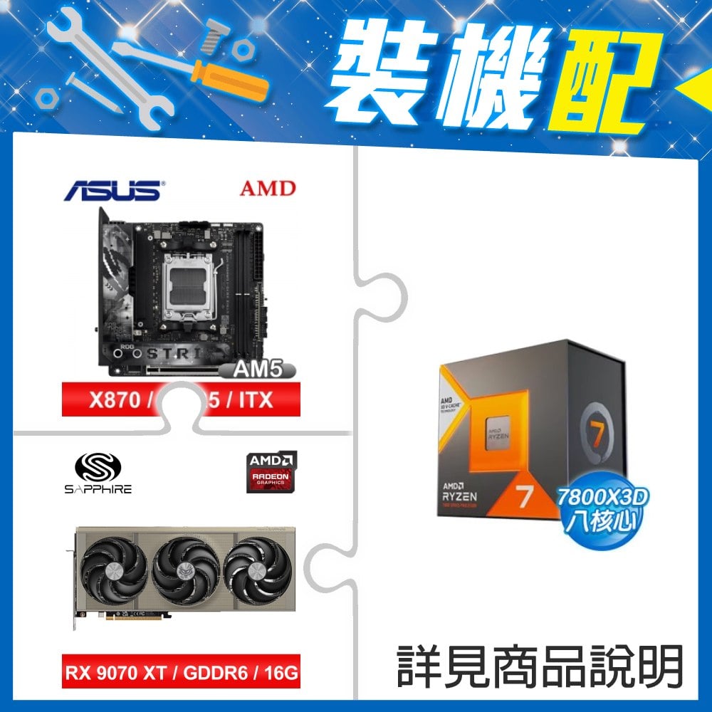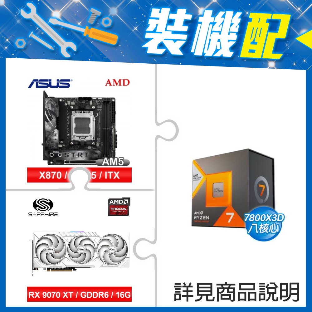 ☆裝機配★ AMD R7 7800X3D+華碩 ROG STRIX X870-I GAMING WIFI ITX主機板+藍寶石 PULSE 脈動 RX 9070 GRE GAMING 12GB 顯示卡