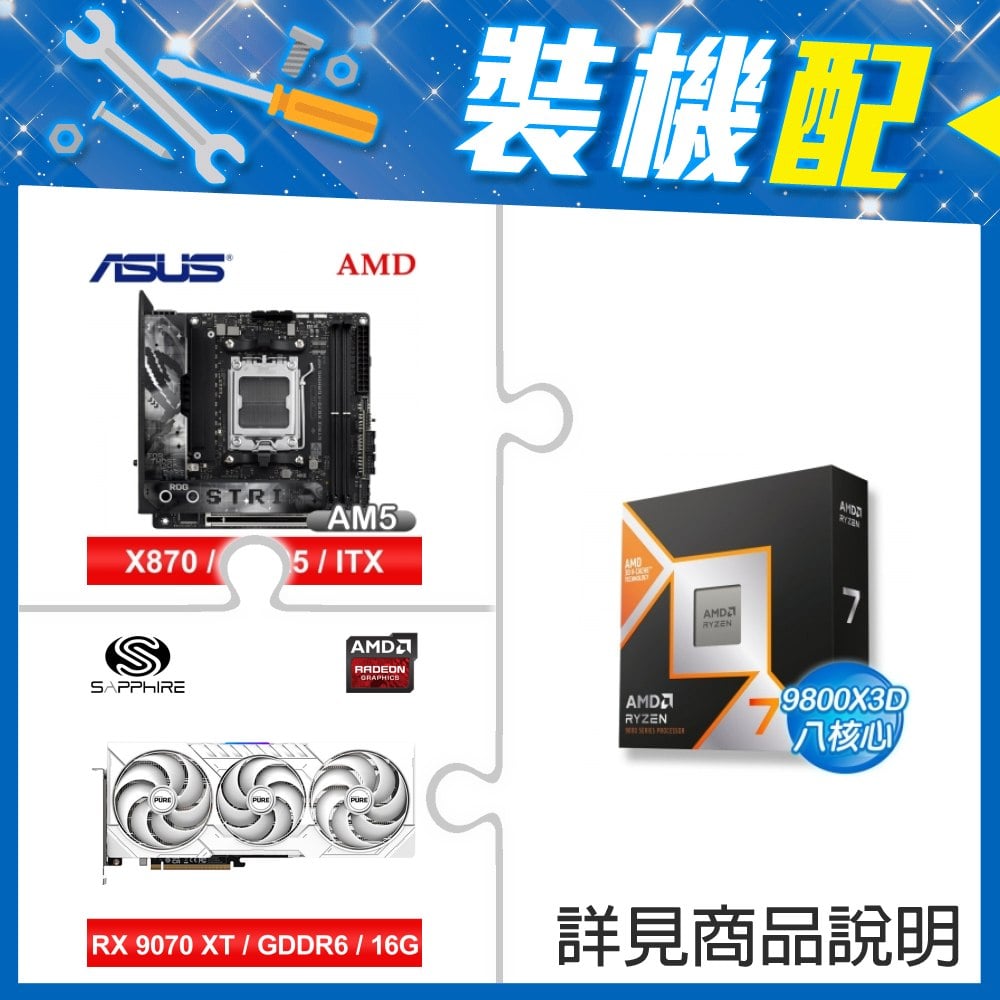 ☆裝機配★ AMD R7 9800X3D+華碩 ROG STRIX X870-I GAMING WIFI ITX主機板+藍寶石 PURE 極地 RX 9070 XT GAMING OC 16GB 顯示卡
