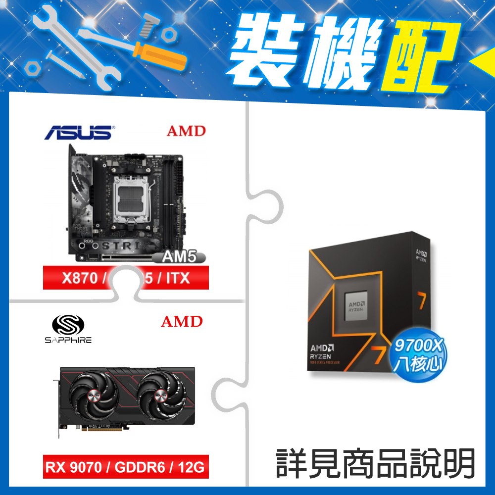 ☆裝機配★ AMD R7 9700X+華碩 ROG STRIX X870-I GAMING WIFI ITX主機板+藍寶石 PULSE 脈動 RX 9070 GRE GAMING 12GB 顯示卡