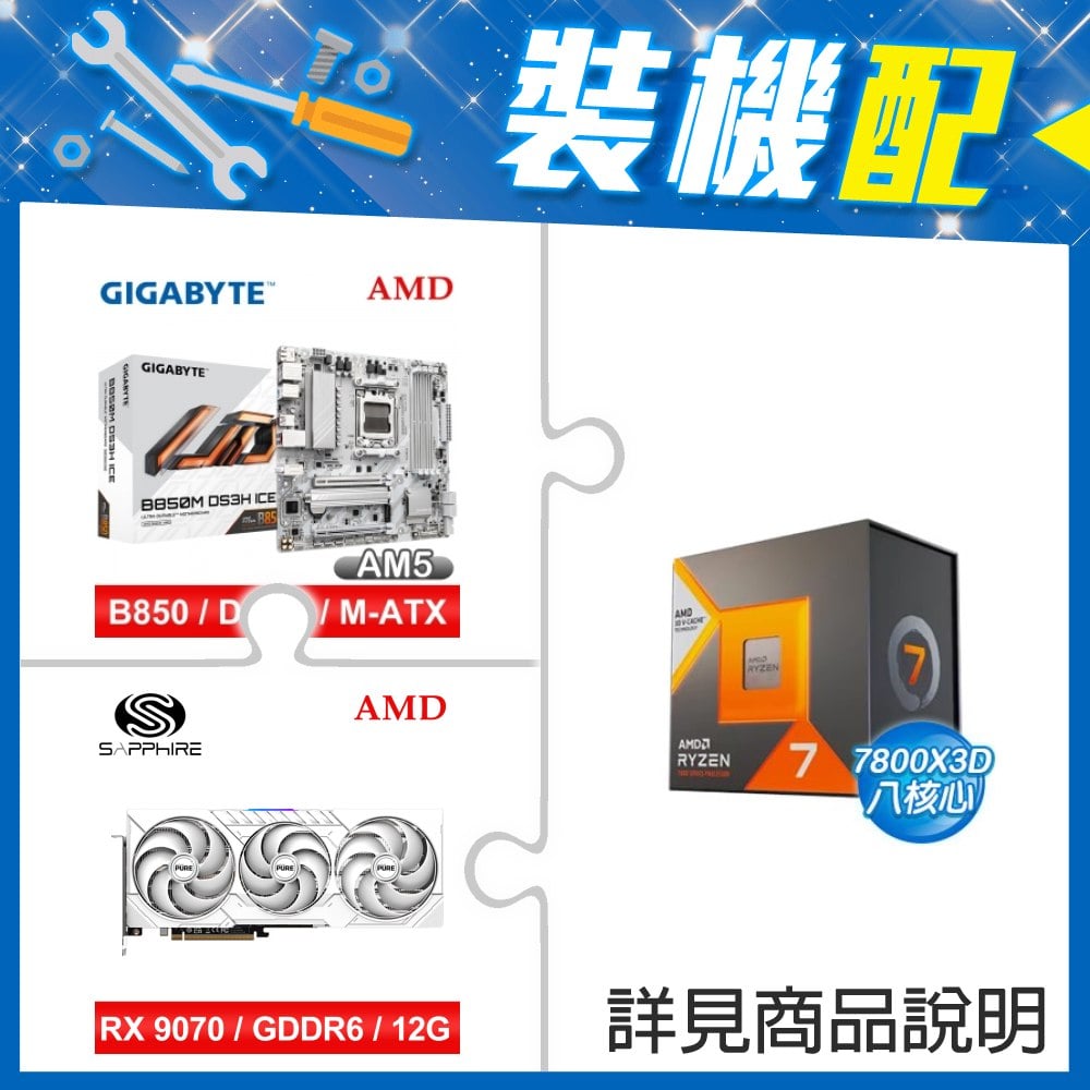 ☆裝機配★ AMD R7 7800X3D+技嘉 B850M DS3H ICE M-ATX主機板+藍寶石 PURE 極地 RX 9070 XT GAMING OC 16GB 顯示卡