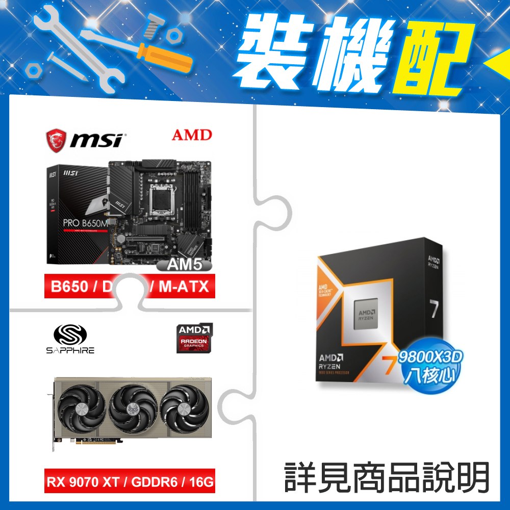 ☆裝機配★ AMD R7 9800X3D+微星 PRO B650M-A WIFI D5 M-ATX主機板+藍寶石 NITRO+ 氮動 RX 9070 XT GAMING OC 16GB 顯示卡