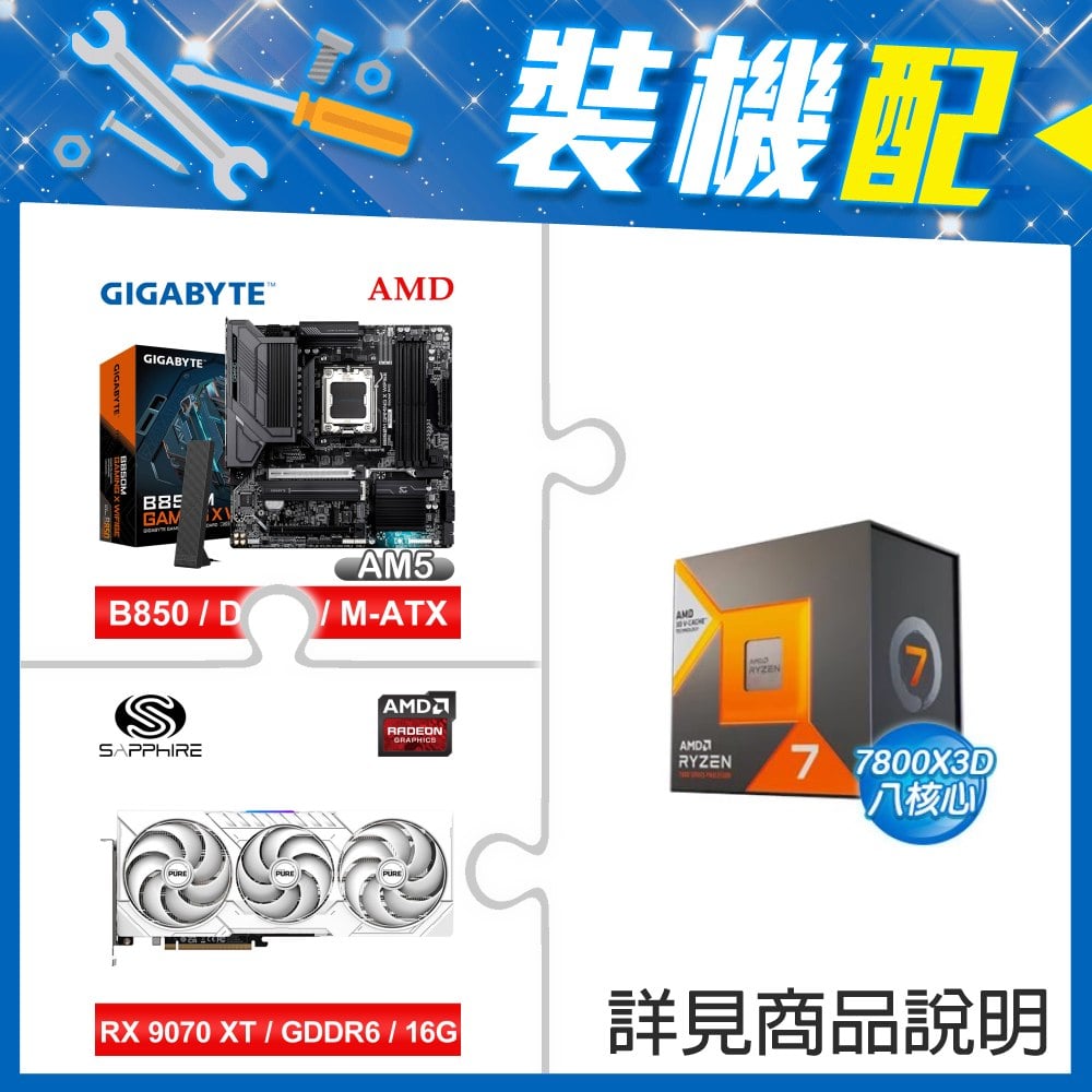 ☆裝機配★ AMD R7 7800X3D+技嘉 B850M GAMING X WIFI6E MATX主機板+藍寶石 PURE 極地 RX 9070 XT GAMING OC 16GB 顯示卡