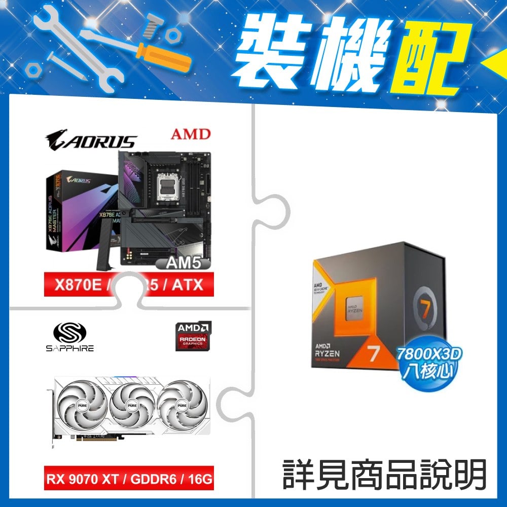 ☆裝機配★ AMD R7 7800X3D+技嘉 X870E AORUS MASTER ATX主機板+藍寶石 PURE 極地 RX 9070 XT GAMING OC 16GB 顯示卡
